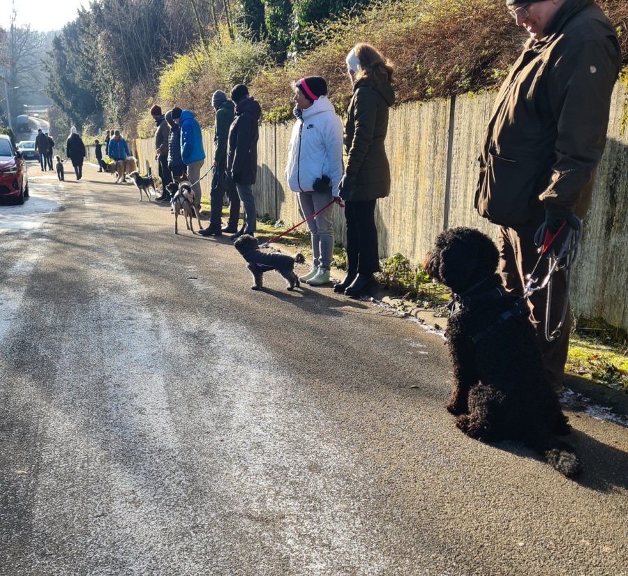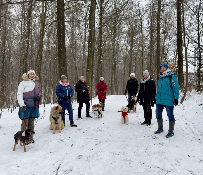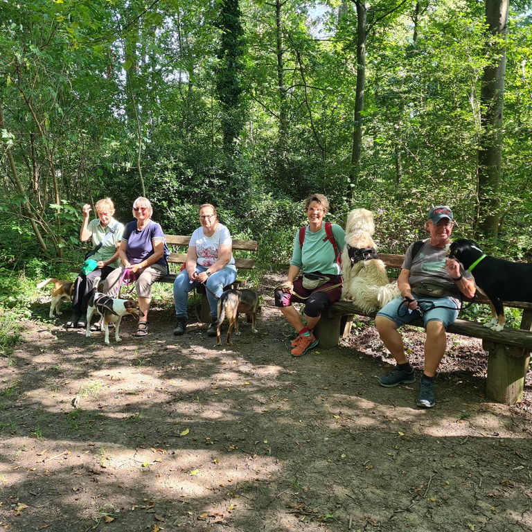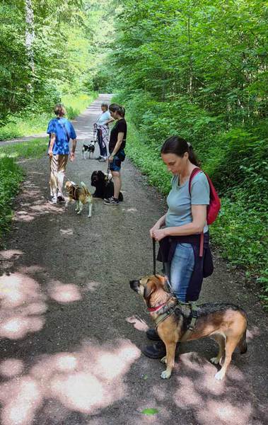 Während des Spaziergangs werden verschiedene Übungen durchgeführt und zwischendurch auch einmal theoretisches Hundewissen vermittelt.